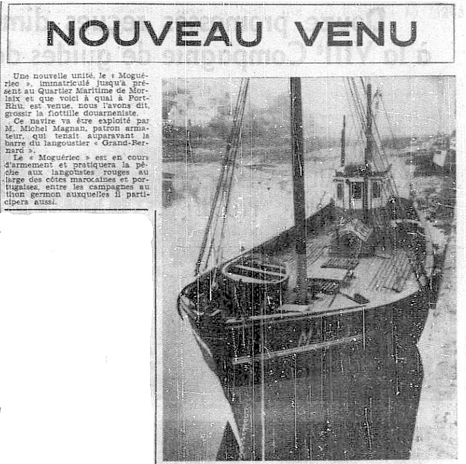 Journal Ouest-France Date 21 novembre 1967 Bateau(x) MOGUÉRIEC - DZ4160 Langoustier - 1967 GRAND BERNARD - DZ3905 Langoustier mauritanien - 1955-1971 Mots-clés Flottille, Armement, Langouste rouge, Campagne thon Lieu(x) Morlaix, Port-Rhu, Douarnenez, Maroc, Portugal Personnes Michel Magnan, Contributeur(s) Audierne Bateaux Image