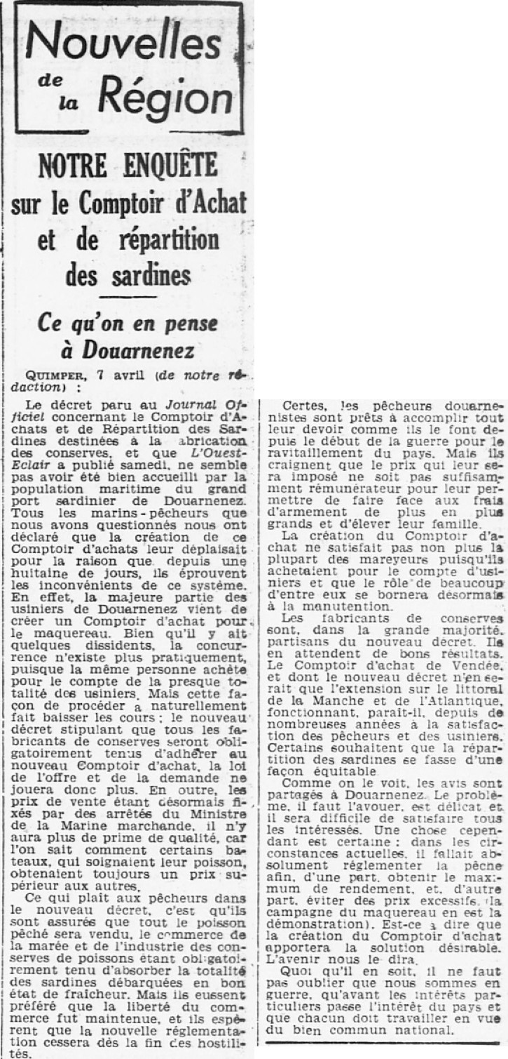 Enquête, Comptoir d'achat, Répartition, Sardines, Décret, Journal officiel, Population maritime, Système, Inconvénients, Concurrence, Loi de l'offre et de la demande, Fixation, Prix, Arrêté ministériel, Guerre, Ravitaillement, Pêcheurs, Mareyeurs, Usiniers, Fabricants, Conserves, Réglementation, Rendement, Solution, Avenir, Intérêt général, Bien commun national