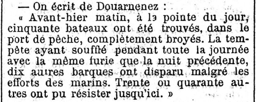 Journal Journal des débats Date 11 décembre 1879 Mots-clés Tempête, Pertes, Dégâts, Chaloupes, Disparition Lieu(x) Douarnenez Contributeur(s) Jacques Join Image