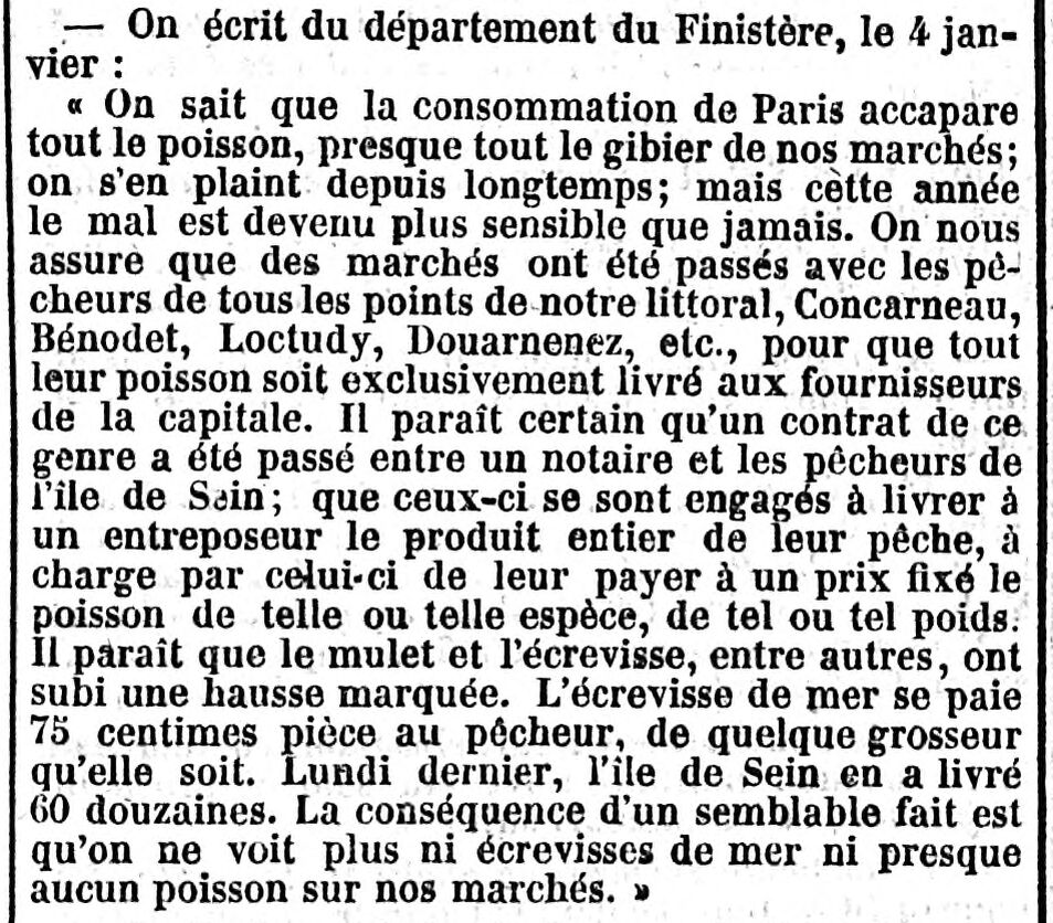 Journal Journal des débats Date 08 janvier 1845 Mots-clés Marché intérieur, Consommation, Capitale, Produits de la pêche, Mulet, Écrevisse de mer, Homard, Hausse, Pénurie, Département, Plaintes Lieu(x) Finistère, Paris, Concarneau, Bénodet, Loctudy, Douarnenez, Île de Sein Contributeur(s) Jacques Join Image