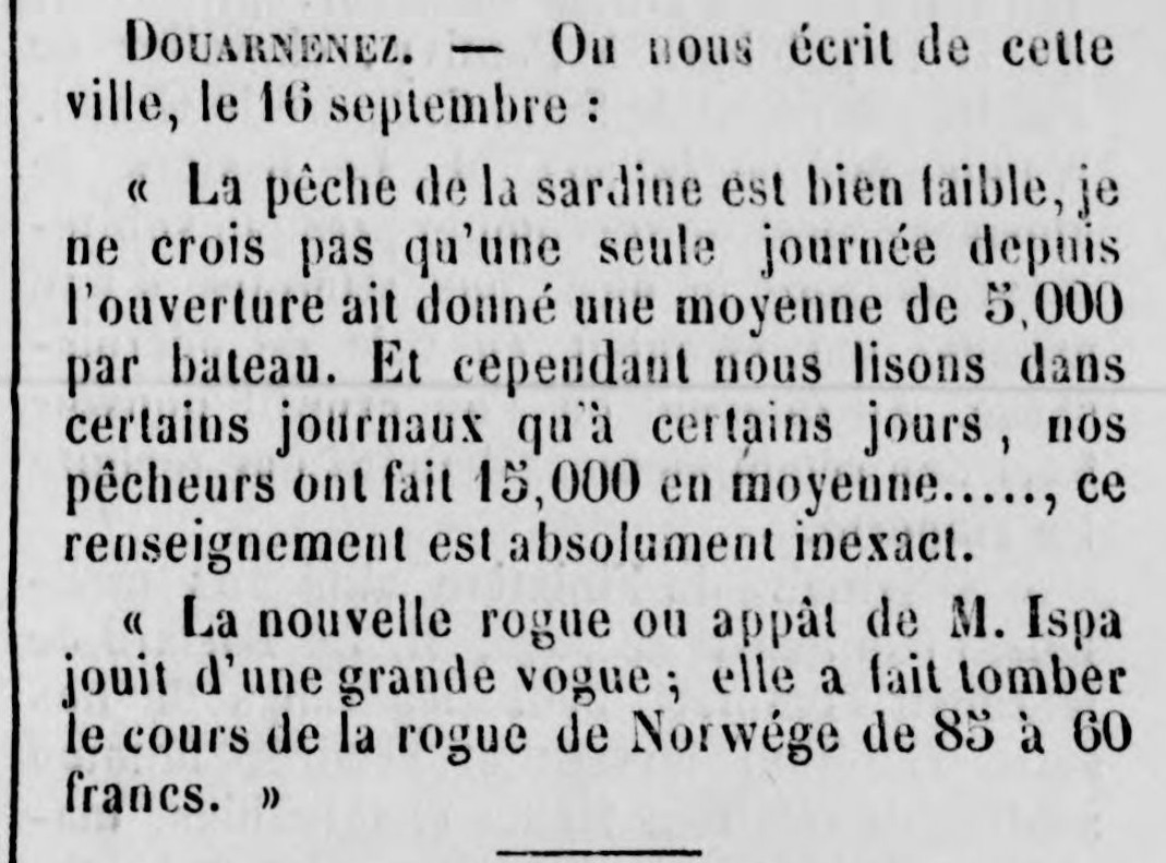 Journal L'Impartial du Finistère Date 20 septembre 1876 Mots-clés Bulletin de pêche, Pêche à la sardine, Quantité très faible, Renseignement, Erreur, Appât, Nouveau, Rogue, Chute, Cours, Rogue de Norvège Lieu(x) Douarnenez, Norvège Personnes M. Ispa Contributeur(s) Jacques Join Image