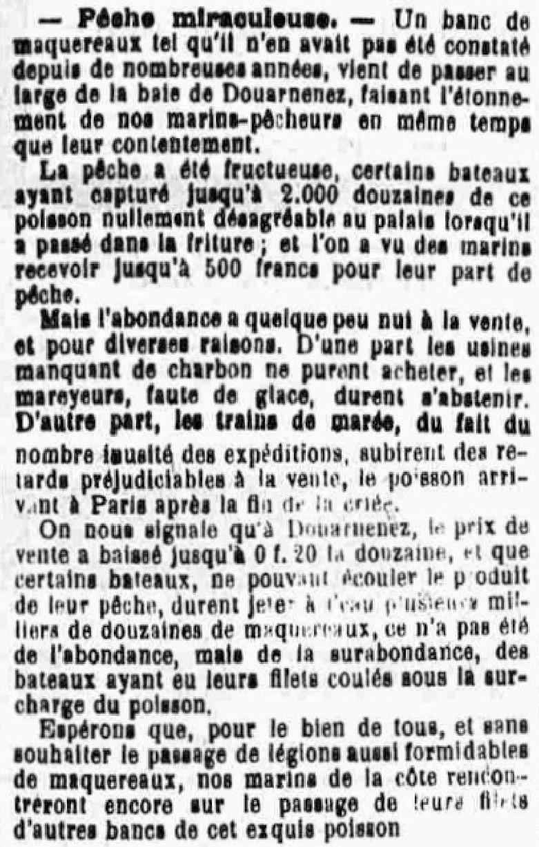 Pêche miraculeuse, Maquereau, Surabondance, Pénurie, Charbon, Usines, Glace, Mareyeurs, Expédition, Trains, Retard, Prix, Baisse, Mévente, Rejet, Filets, Surcharge