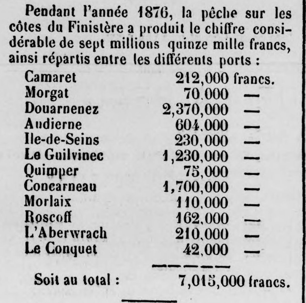 Journal L'Impartial du Finistère Date 02 juillet 1976 Mots-clés Statistiques de la pêche, Production, Valeur, Chiffres, Répartition Lieu(x) Finistère, Camaret, Morgat, Douarnenez, Audierne, Île de Sein, Le Guilvinec, Quimper, Concarneau, Morlaix, Roscoff, L'Aber-Wrac'h, Le Conquet Contributeur(s) Jacques Join Image