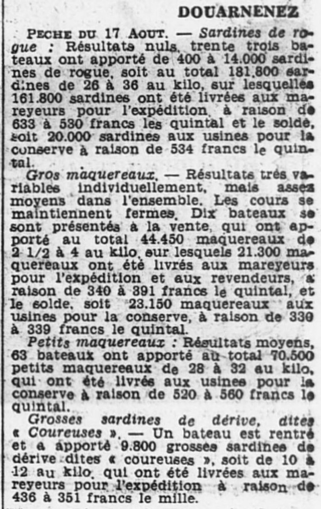 Journal L'Ouest-Eclair Date 19 août 1939 Mots-clés Bulletin de pêche, Sardine de rogue, Gros maquereau, Petit maquereau, Sardine de dérive, Sardine coureuse, Quantité, Prix, Résultats Lieu(x) Douarnenez Contributeur(s) Jacques Join Image