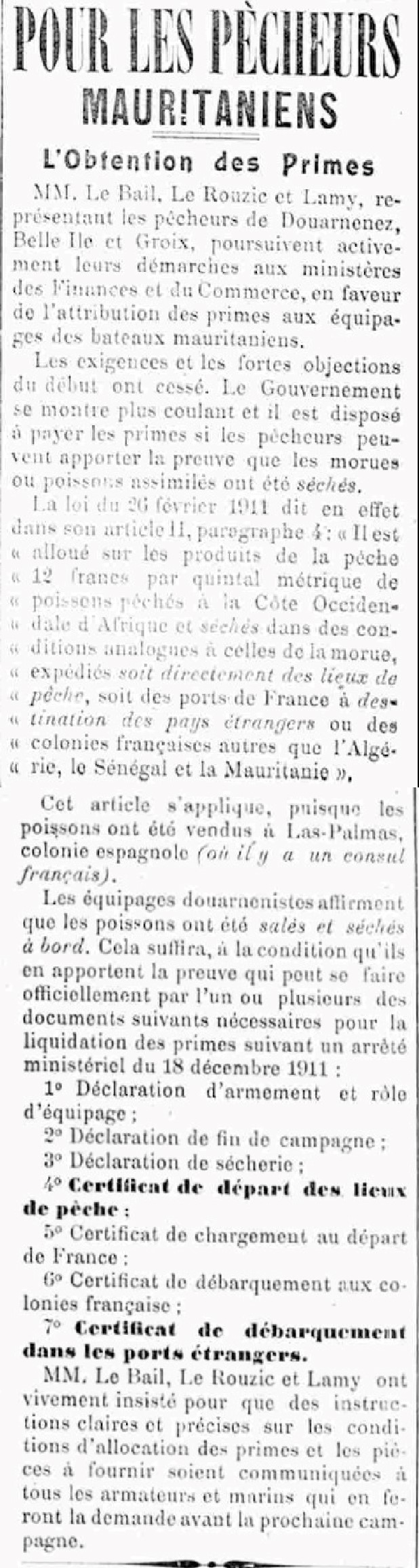 Journal Le Citoyen Date 15 juin 1912 Mots-clés Députés, Démarches, Primes, Ministre du Commerce, Ministre des Finances, Pêcheurs bretons, Mauritaniens, Morue, Poisson séché, Poisson salé, Liquidation, Pièces justificatives, Certificats, Communication, Instructions, Armateurs, Marins Lieu(x) Douarnenez, Belle-Île, Groix, Mauritanie, Algérie, Sénégal, Las Palmas, Canaries Personnes MM. Le Bail, Le Rouzic, Lamy Contributeur(s) Jacques Join Image