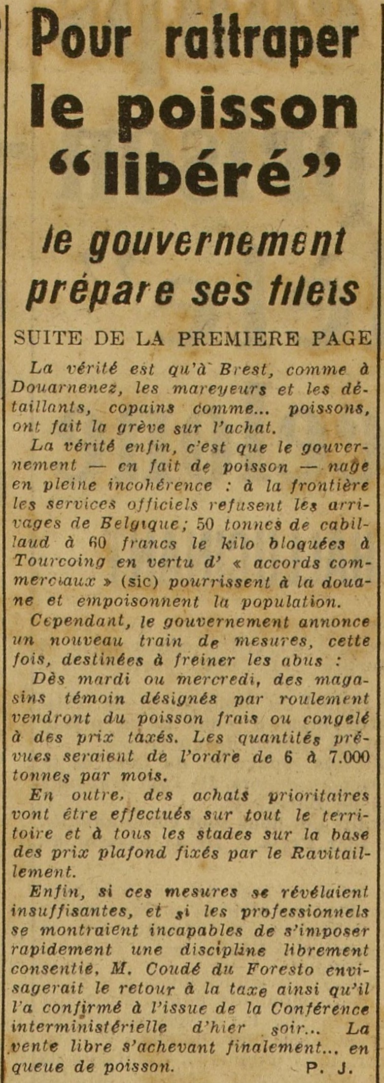 Journal Le Franc-tireur Date 08 avril 1948 Mots-clés Mareyeurs, Détaillants, Grève, Achat de poisson, Gouvernement, Mesures, Douane, Population, Lutte, Abus, Ravitaillement, Fixation, Prix maximum, Taxe, Liberté de vente Lieu(x) Brest, Douarnenez, Belgique, Tourcoing Personnes M. Coudé du Foresto Contributeur(s) Jacques Join Image