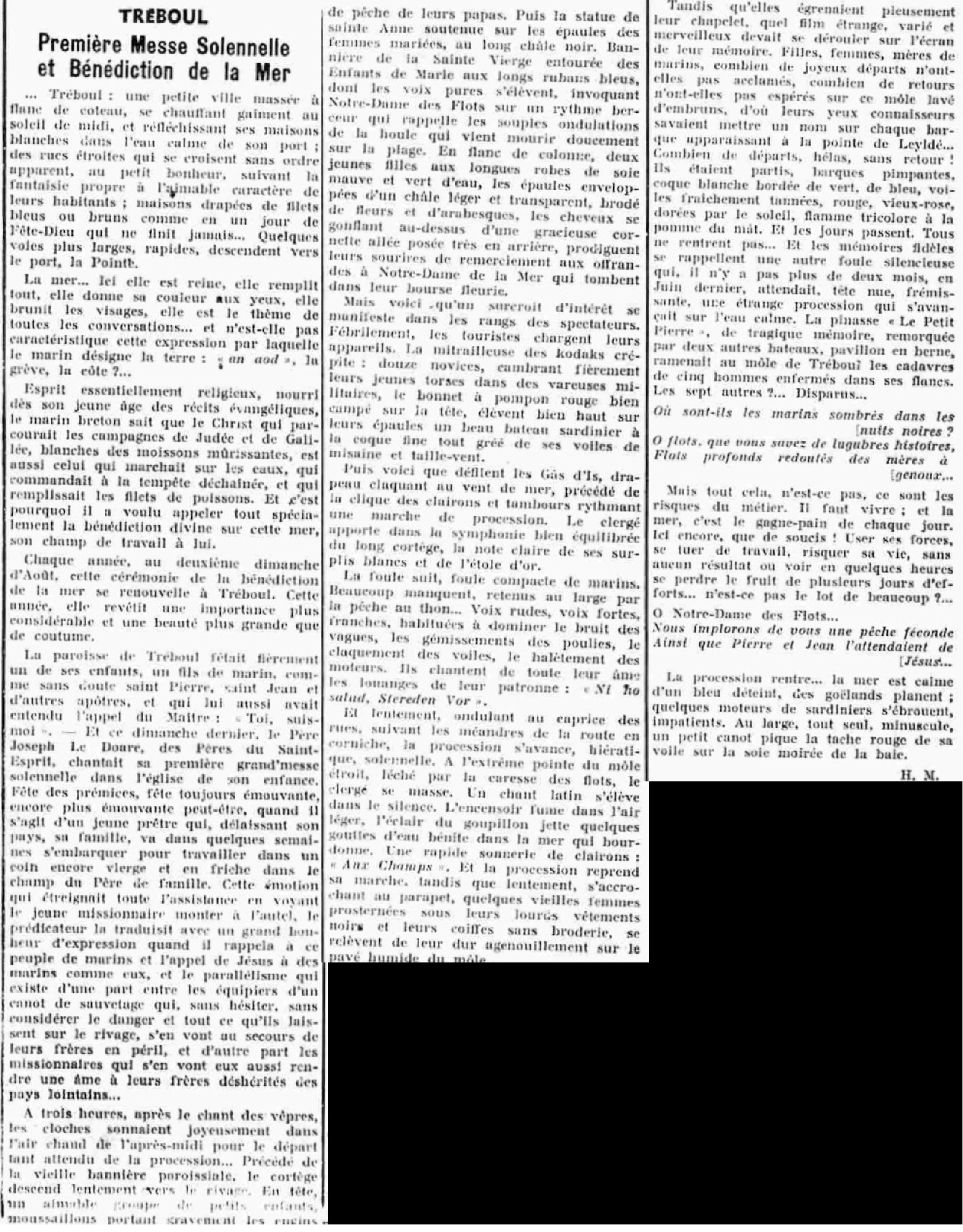 Journal Le Progrès du Finistère. Principal Date 20 août 1938 Bateau(x) PETIT PIERRE - DZ3304 Pinasse - 1937-1945 Mots-clés Messe, Bénédiction de la mer, Cérémonie, Prêtre, Missionnaire, Prédicateur, Procession, Bannière, Cortège, Statue, Offrande, Touristes, Maquette, Musique, Clergé, Foule, Môle, Pinasse, Remorquage, Cadavres, Disparus en mer Lieu(x) Tréboul Personnes père Joseph Le Doaré Contributeur(s) Jacques Join Image