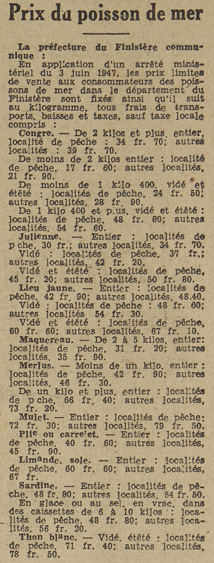 Journal Le Télégramme de Brest Date 11 juin 1947 Mots-clés Préfecture, Communication, Prix du poisson, Arrêté ministériel, Prix limite de vente, Consommateurs, Département, Congre, Julienne, Lieu jaune, Maquereau, Merlus, Mulet, Plies, Carrelet, Limande, Sole, Sardine, Thon blanc Lieu(x) Finistère Contributeur(s) Jacques Join Image