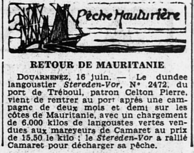 Journal L'Ouest-Eclair Date 17 juin 1935 Bateau(x) STEREDEN VOR - DZ2472 Dundee mauritanien - 1922-1934 Mots-clés Dundée, Langoustier mauritanien, Retour de campagne, Chargement, Langoustes vertes, Vente, Mareyeurs, Prix, Quantité Lieu(x) Douarnenez, Tréboul, Mauritanie, Camaret Personnes patron Pierre Celton Contributeur(s) Jacques Join Image