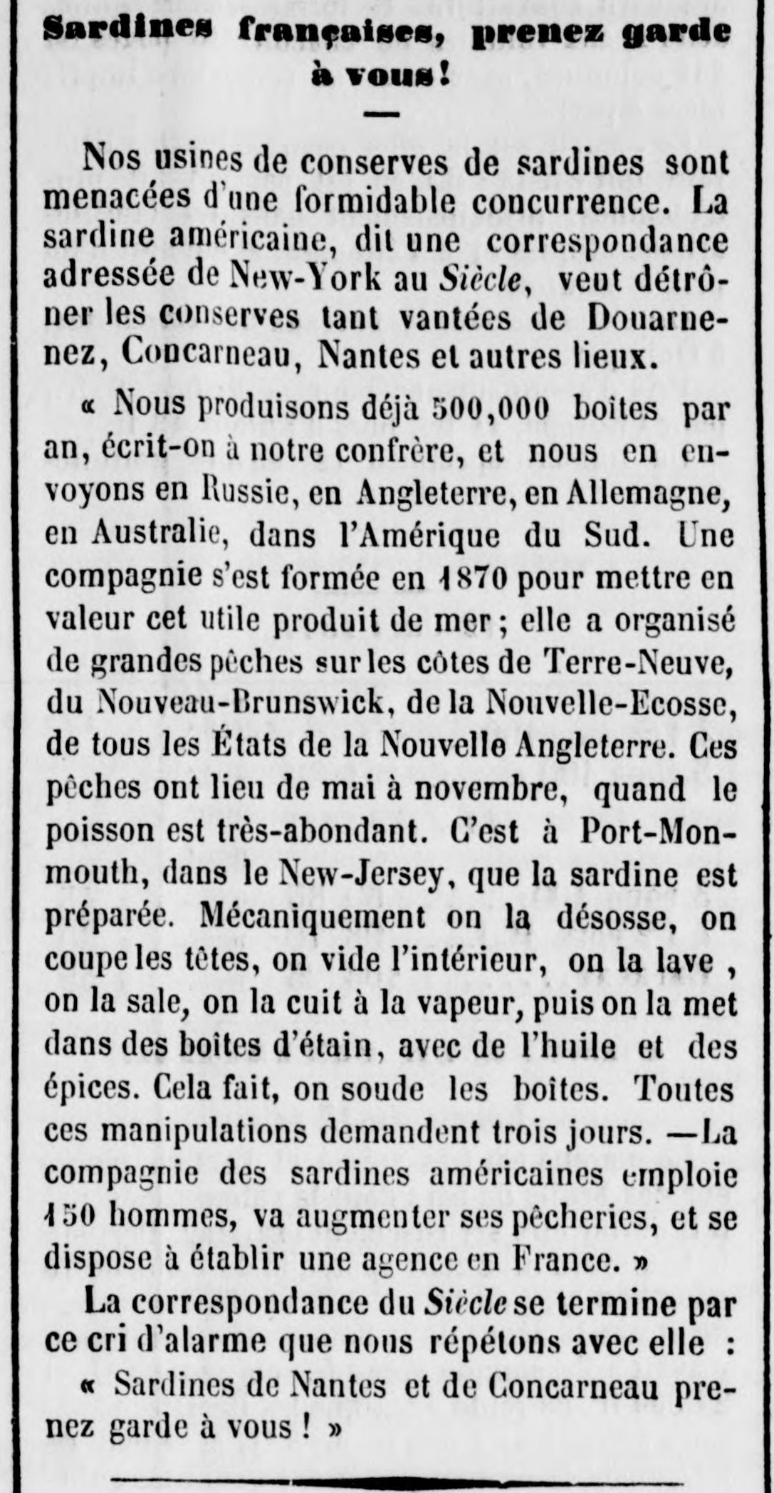 Journal L'Impartial du Finistère Date 15 juin 1877 Mots-clés Usines, Conserves, Sardine, Concurrence étrangère, Alarme, Avertissement Lieu(x) New-York, Douarnenez, Concarneau, Nantes, Russie, Angleterre, Allemagne, Australie, Amérique du Sud, Terre-Neuve, Nouveau-Brunswick, Nouvelle-Écosse, Nouvelle-Angleterre, Port Monmouth, New-Jersey Contributeur(s) Jacques Join Image