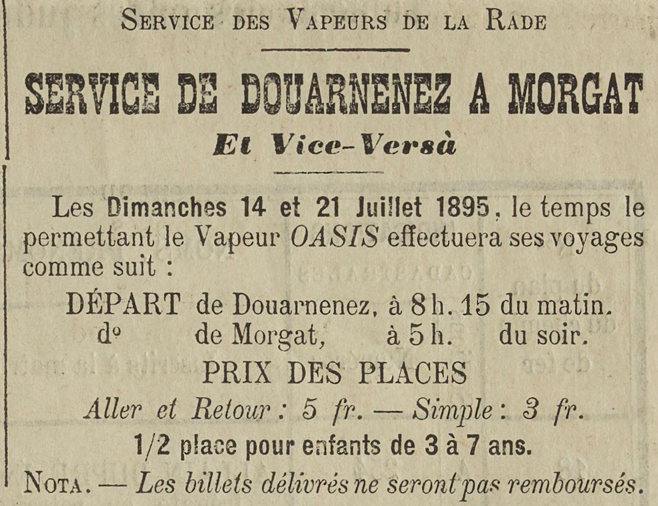 Journal Le Bas-Breton Date 13 juillet 1895 Autres bateaux vapeur "Oasis" Mots-clés Vapeur, Service régulier, Transport de passagers, Voyage, Prix, Tarifs, Billets, Horaire, Départ Lieu(x) Douarnenez, Morgat Contributeur(s) Jacques Join Image