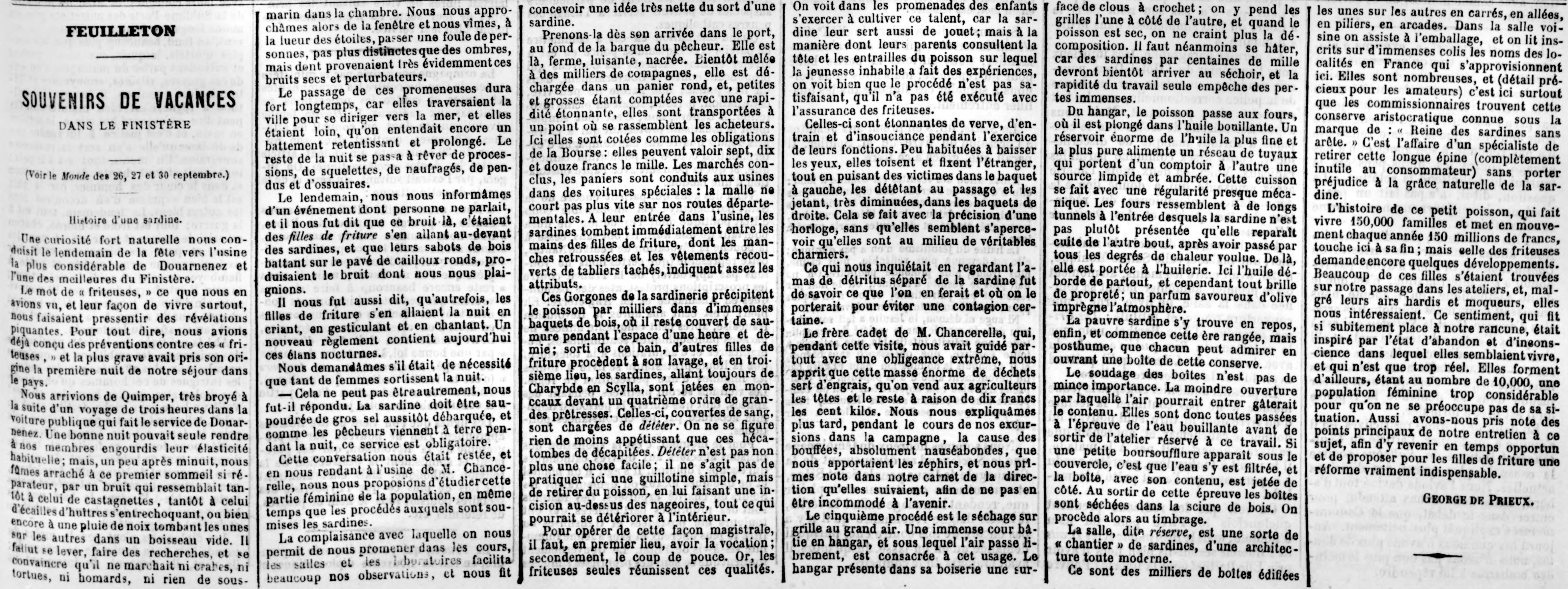 Souvenir, Vacances, Usine, Femmes de friture, Sardines, Sabots, Bruit, Étude, Population, Observations, Déchargement, Paniers, Saumurage, Lavage, Étêtage, Déchets de poisson, Engrais, Odeur, Séchage, Grilles, Cuisson, Huile bouillante, Mise en boîte, Soudage , Timbrage, Emballage, Sardinières, Réforme, Histoire