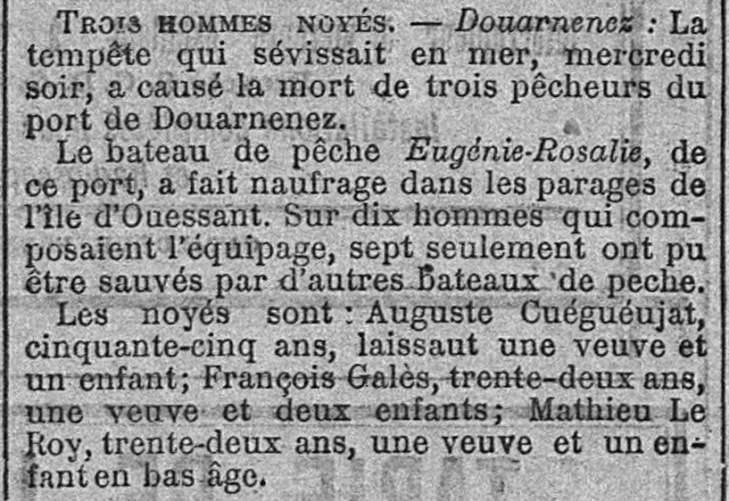 Journal L'Intransigeant Date 28 mai 1899 Bateau(x) EUGENE ROSALIE - DZ216 Chaloupe - 1897-1899 Mots-clés Tempête, Naufrage, Chaloupe, Rescapés, Noyés, Veuves, Orphelins Lieu(x) Douarnenez, Ouessant Personnes Auguste Guéguéniat, François Galès, Mathieu Le Roy Contributeur(s) Jacques Join Image
