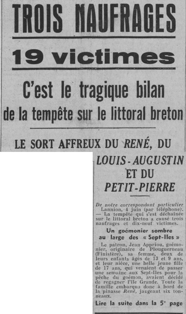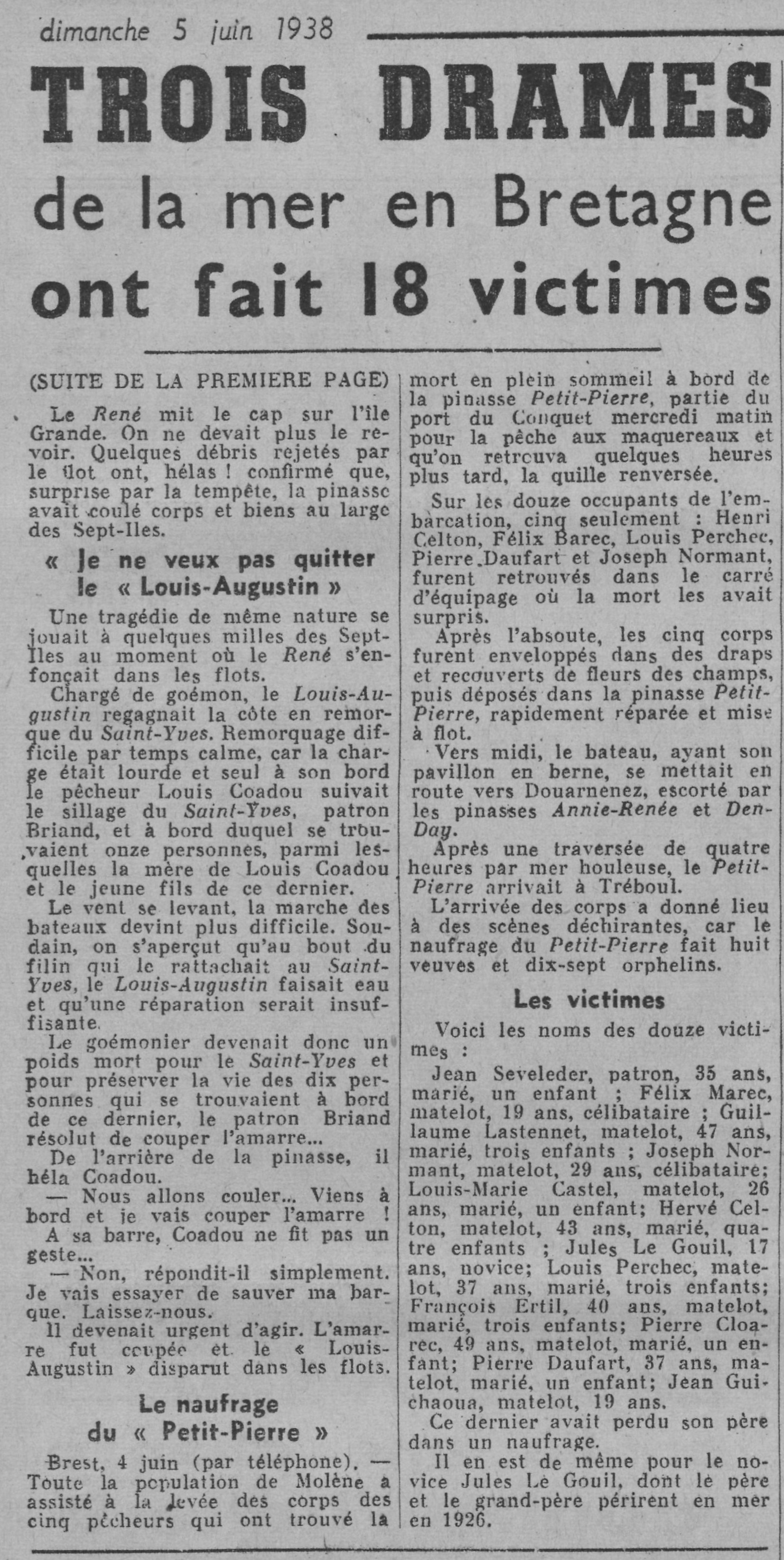 patron Jean Appriou, Louis Coadou, patron Briand, Hervé Celton, Félix Marec, Louis Perchec, Pierre Daufart, Joseph Normant, patron Jean Sévéléder, Guillaume Lastennet, Louis-Marie Castel, novice Jules Le Gouil, François Fertil, Pierre Cloarec, Jean Guichaoua