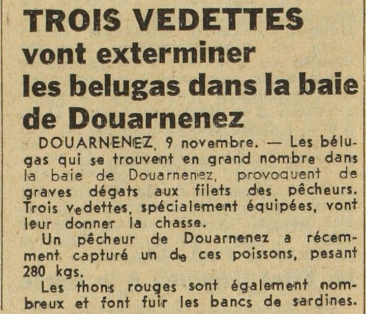 Journal Ce soir Date 10 novembre 1950 Mots-clés Vedettes, Chasse, Destruction, Bélugas, Baie, Dégâts, Filets, Pêcheurs, Capture, Thon rouge, Fuite, Bancs, Sardines Lieu(x) Douarnenez, Baie de Douarnenez Contributeur(s) Jacques Join Image
