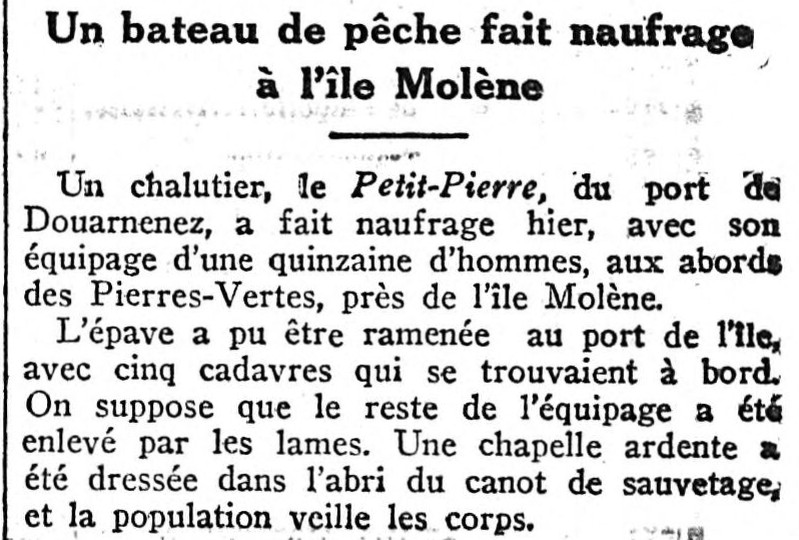 Journal Journal des débats Date 04 juin 1938 Bateau(x) PETIT PIERRE - DZ3304 Pinasse - 1937-1945 Mots-clés Naufrage, Pinasse, Remorquage, Épave, Cadavres, Chapelle , Abri, Canot de sauvetage, Population, Veille, Corps Lieu(x) Molène, Douarnenez, Les Pierres Vertes Contributeur(s) Jacques Join Image