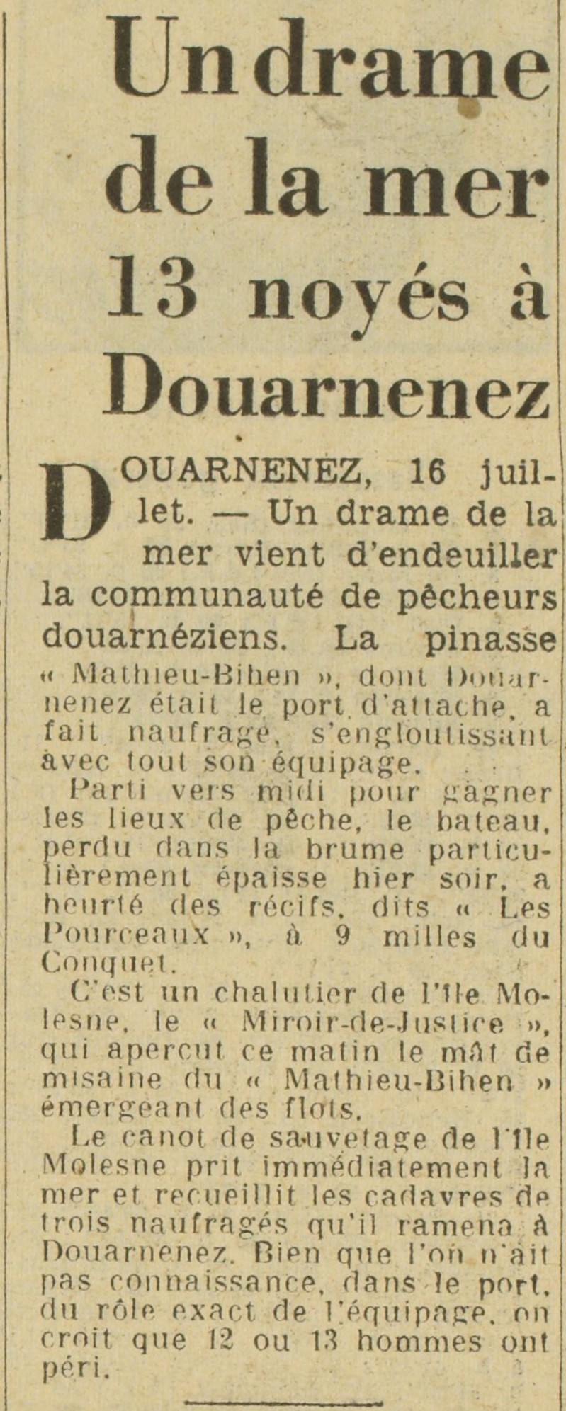 Journal Combat Date 17 juillet 1950 Bateau(x) MATHIEU BIHEN - DZ3100 Pinasse - 1932-1950 Autres bateaux "Miroir-de-Justice" Mots-clés Drame de mer, Naufrage, Pinasse, Deuil, Communauté des pêcheurs, Brume, Récifs, Chalutier, Découverte, Canot de sauvetage, Cadavres, Péris en mer Lieu(x) Douarnenez, Rocher des Pourceaux, Le Conquet, Île de Molène Contributeur(s) Jacques Join Image