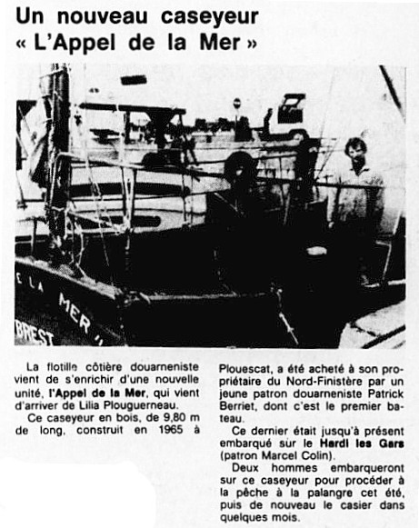 Journal Ouest-France Date 10 juin 1981 Bateau(x) APPEL DE LA MER II - DZ267755 1981 HARDI LES GARS - DZ184753 Chalutier - 1973-2005 Mots-clés Caseyeur, Palangre, Casiers Lieu(x) Plouguerneau, Plouescat Personnes Patrick Berriet, Marcel Colin, Contributeur(s) Audierne Bateaux Image
