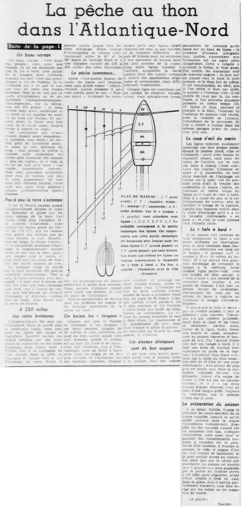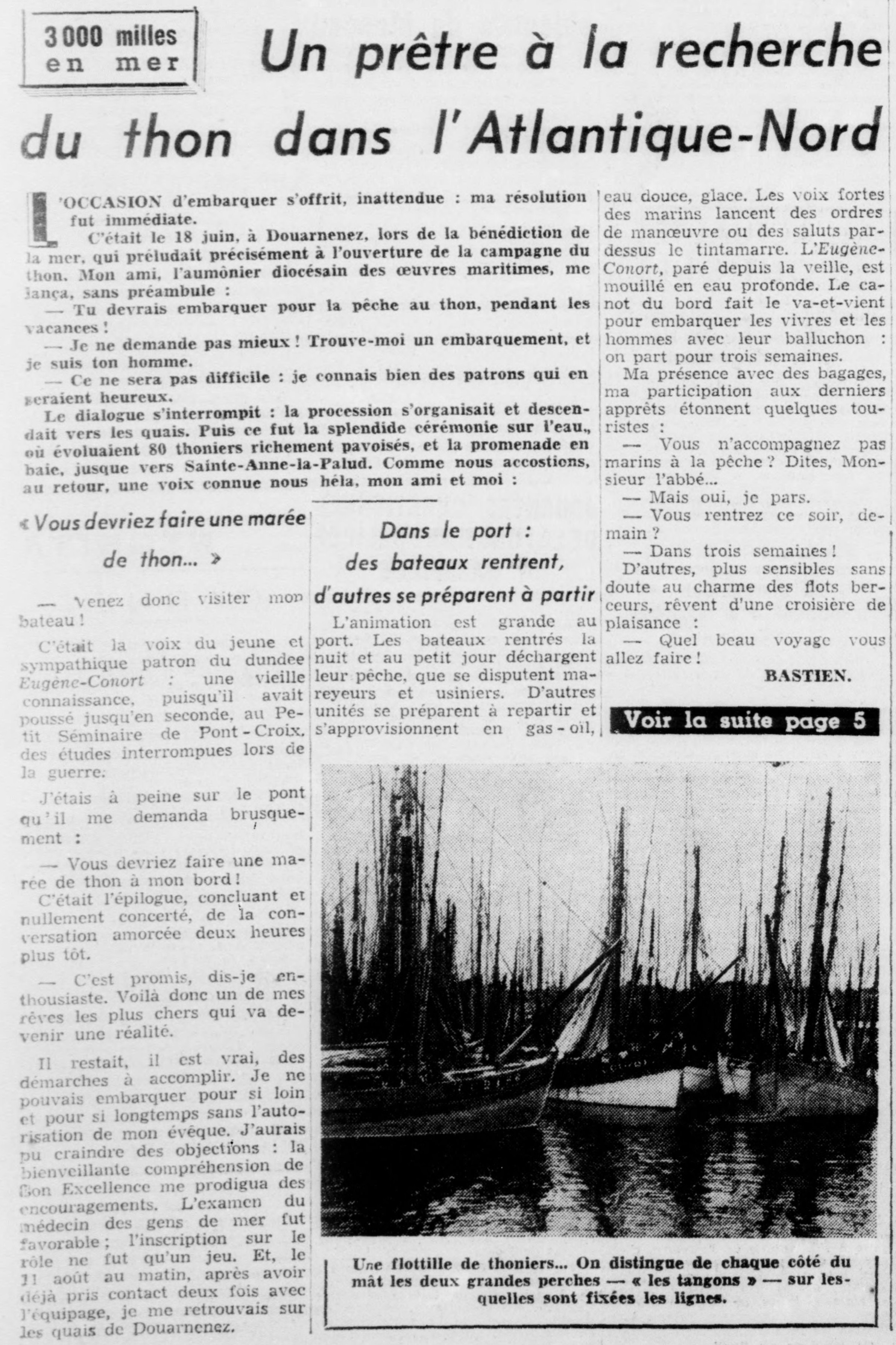 Prêtre, Embarquement, Thonier, Malamock, Bénédiction de la mer, Campagne de pêche, Pêche au thon, Autorisation, Évêque, Examen, Médecin de la marine, Inscription, Rôle d'équipage, Étonnement, Touristes, Curiosité, Aventure, Tangons, Hameçons, Indications, Banc, Oiseaux, Volaille, Marsouins, Ligne, Hale-à-bord, Thon blanc, Germon, Vidage, Conservation, Glace