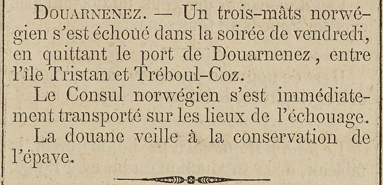 Journal Le Bas-Breton Date 08 octobre 1887 Mots-clés Trois-mâts, Échouement, Vice-consul de Norvège, Constatation, Douane, Conservation, Épave Lieu(x) Douarnenez, Norvège, Île Tristan, Tréboul Contributeur(s) Jacques Join Image