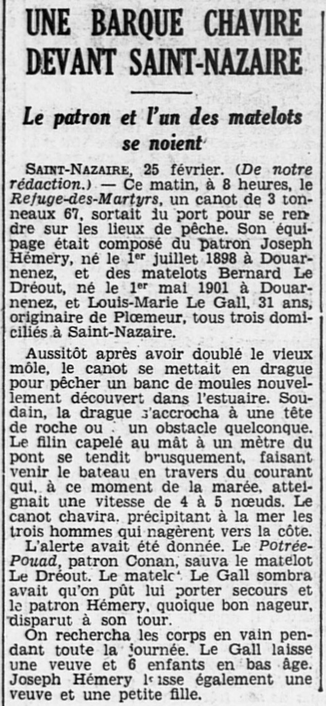 patron Joseph Hémery, matelots Bernard Le Dréout et Louis-Marie Le Gall, patron Conan