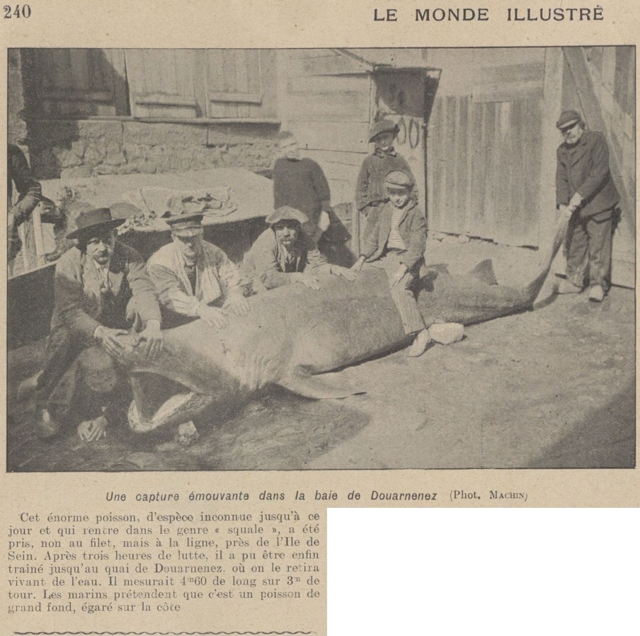 Journal Le Monde illustré Date 05 janvier 1907 Mots-clés Capture, Squale, Requin, Requin pèlerin, Ligne, Lutte Lieu(x) Baie de Douarnenez, Île de Sein, Douarnenez Contributeur(s) Jacques Join Image