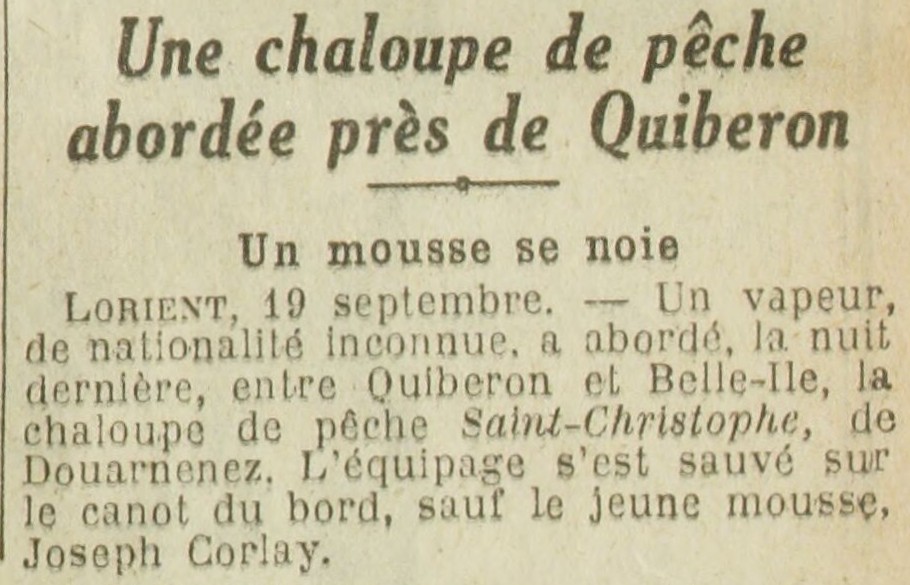 Journal Excelsior Date 20 septembre 1924 Bateau(x) SAINT CHRISTOPHE - DZ2041 Chaloupe non pontée - 1913-1924 Mots-clés Vapeur, Abordage, Chaloupe, Équipage sauvé, Canot annexe, Mousse, Noyé Lieu(x) Quiberon, Belle-Île, Douarnenez Personnes mousse Joseph Chorlay Contributeur(s) Jacques Join Image
