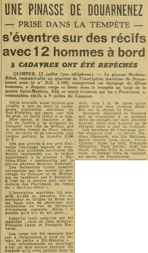 patron Mathieu Hascoët, Jean Ansquer, François Lossy, François Kervarec, Mathieu Hascoët fils, Pierre Cloarec, Jules Le Gall, François Gloaguen, Paul Perrot, Noël Le Guen, Charles Nilly, Louis Pencalet