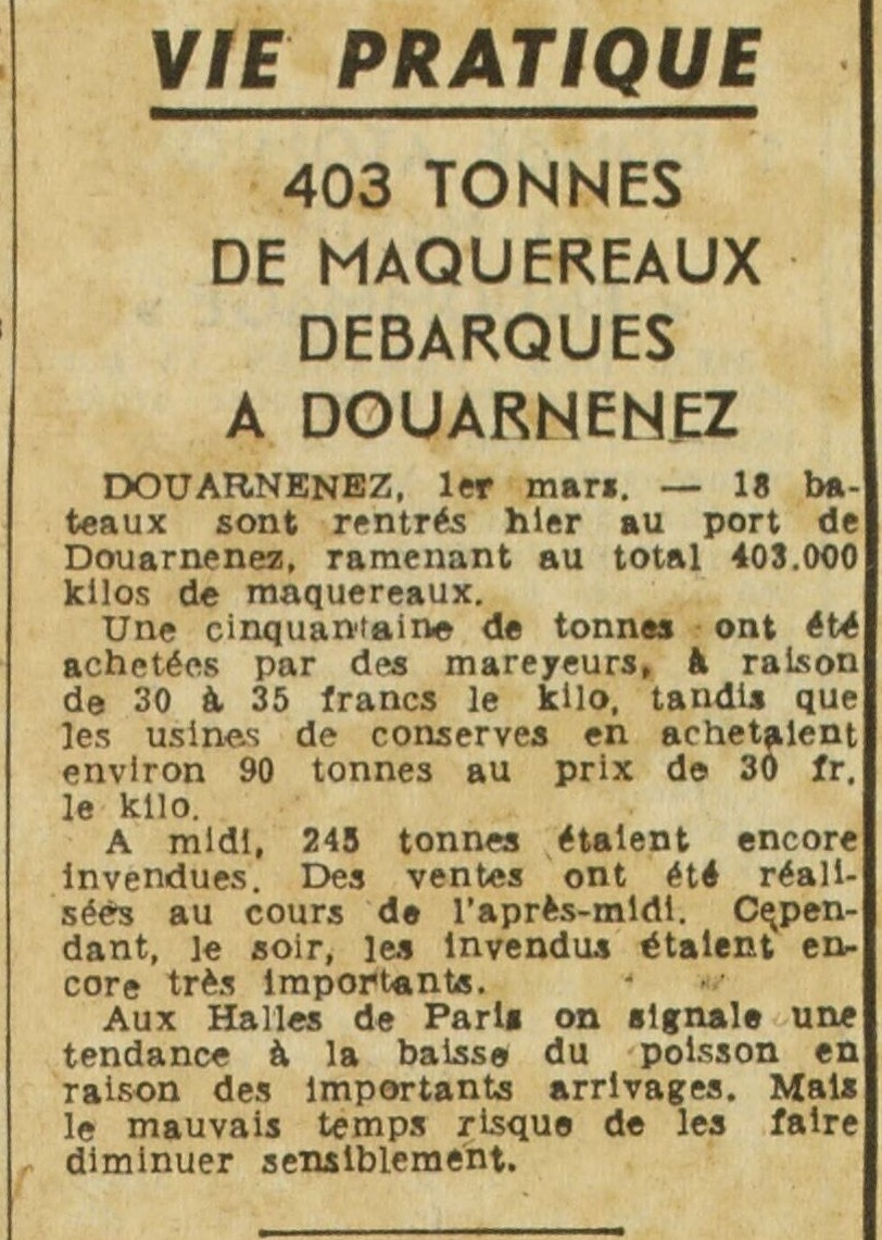 Journal Combat Date 02 mars 1949 Mots-clés Débarquement, Maquereaux, Arrivages importants, Achat, Mareyeurs, Conserveries, Invendus, Halles, Prix, Baisse, Mauvais temps, Risque, Changement Lieu(x) Douarnenez, Paris Contributeur(s) Jacques Join Image